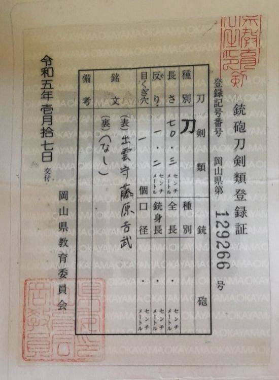 Certificato prefettizio di registrazione delle armi da fuoco e delle spade N° 129266 in copia, poichι il documento originale deve essere restituito alle autoritΰ giapponesi.