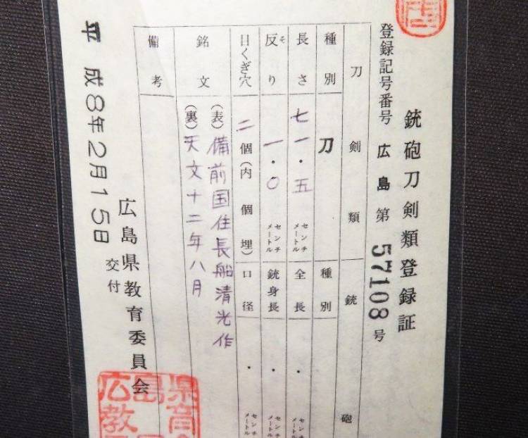 Le lame delle katane forgiate a mano sono registrate presso l´Agenzia per gli Affari Culturali come opere d´arte e presso il Consiglio dell´Istruzione (Comitato per la protezione dei beni culturali). Ogni spada è dotata di una carta di registrazione rilasciata dal Consiglio dell´Istruzione presso la Prefettura di competenza. Disponibile la copia in quanto l´originale deve essere conservato in Giappone.