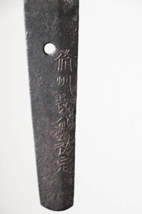 La spada, forgiata intorno al 155o, reca la firma (alla sinistra del nakago, lato omote) 備州 長舩 祐定 (Bishu Osafune Sukesada), un membro della famosa stirpe dei maestri spadai Sukesada 祐定 della provincia di Bizen attivi tra il periodo Kamakura e il perodo Muromachi.