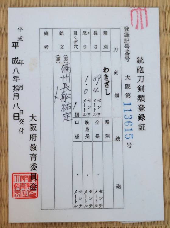 Certificato ufficiale di registrazione delle spade rilasciato dal Consiglio per l´Istruzione della Prefettura di Osaka, che ne certifica l´autenticità.