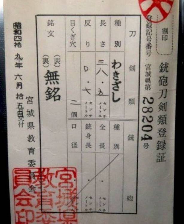 Certificato ufficiale di registrazione delle spade rilasciato dal Consiglio per l´Istruzione presso la Prefettura che ne certifica l´autenticità.