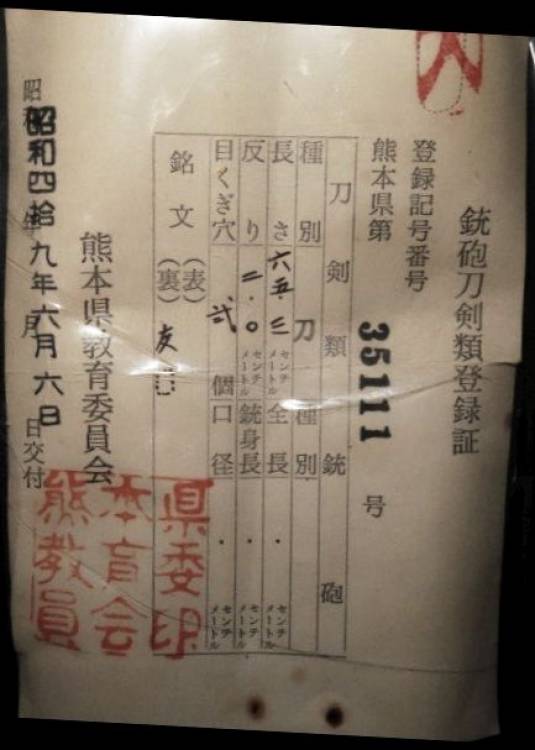 Katana realizzata da Tomo 〇, 友◯. Certificato prefettizio di registrazione delle spade N.35111 in copia (il documento originale deve essere restituito alle autorità).