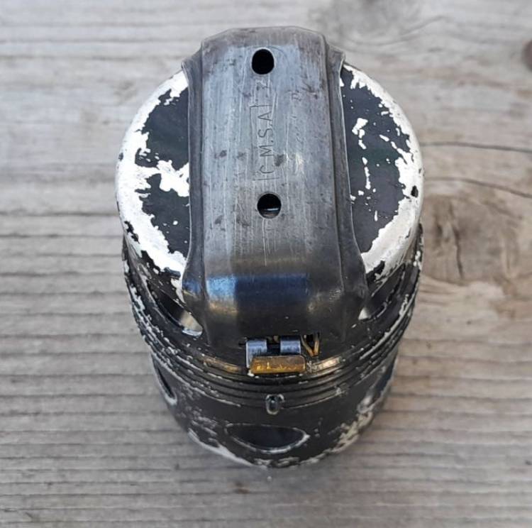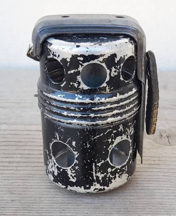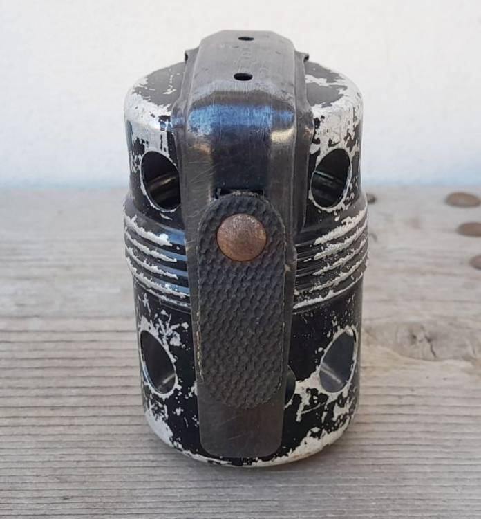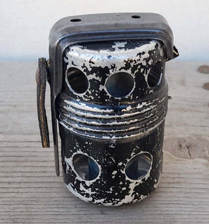 ESTREMAMENTE RARA. BOMBA A MANO ´Po.55´ A TEMPO. BREVETTO DEL 1952 PROGETTATA DA ETTORE MANZOLINI. NE FU COSTRUITO UN UNICO LOTTO DALLA ´C.M.S.A.´ (Costruzioni Meccaniche Aeronautiche Società Anonima) DI MARINA DI PISA, DISTRIBUITO ALLA SOLA AVIAZIONE.