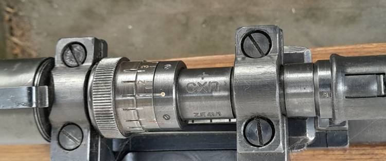 OTTICA CHIARA, CON COPRILENTI. MARCATA ´cxn - ZF.41/1´. ATTACCHI MARCATI ´dov´ (Waffenwerke Brünn AG, Werk Wsetin, Wsetin/Mähren (Vsetín), Protektorat Böhmen und Mähren (Tschechoslowakei). COMPLETA DI SCATOLA DI TRASPORTO IN COLORAZIONE GIALLO CONTINENTALE MARCATA ´jvb´ (Wessel & Müller, Beschlagfabrik, Luckenwalde, Brandenburg).