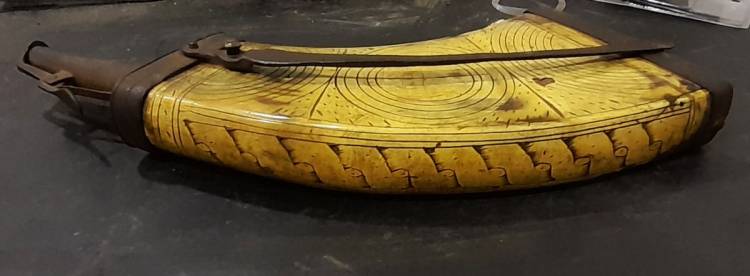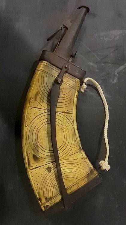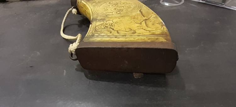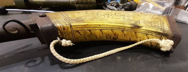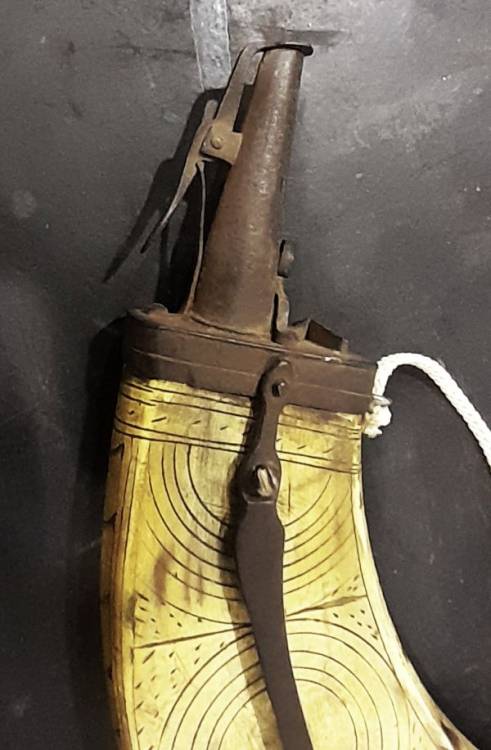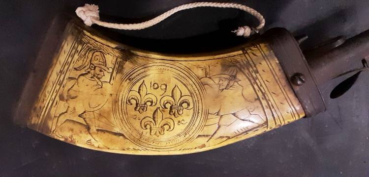 BELLA FIASCA PER POLVERE FRANCESE DEI PRIMI ANNI DEL ´600. COSTRUITA IN CORNO E FERRO, è COMPLETAMENTE GRAFFITA CON MOTIVI ANTROPOMORFI E I TRE GIGLI DI FRANCIA. CONDIZIONI MOLTO BUONE.