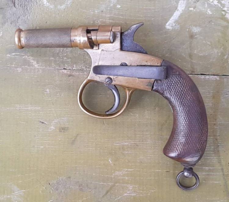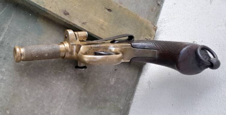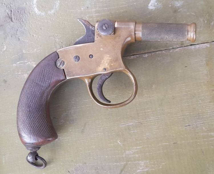 Rarissima pistola accenditore britannica ´Igniter´. Veniva fornita ai Royal Engineers e alla Royal Navy per accendere la miccia nei lavori di brillamento e demolizione. Fu prodotta dal 1880 al 1915 circa. La parte esterna della canna veniva svitata e la miccia veniva fatta passare attraverso di essa, per poi essere riavvitata.