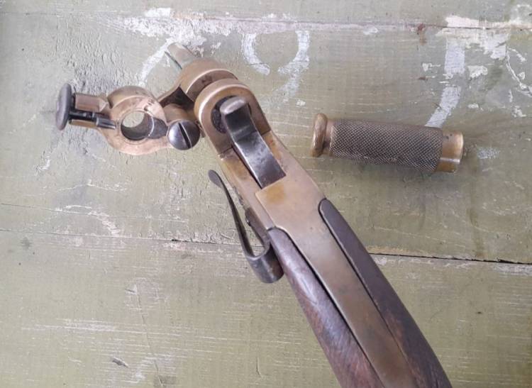 Per accendere la miccia veniva utilizzata una speciale cartuccia a salve. Presenta sul lato destro, probabilmente un´arma della Marina. L´impugnatura presenta una scheggiatura sul lato destro la ´Broad Arrow WD´ (War Department).