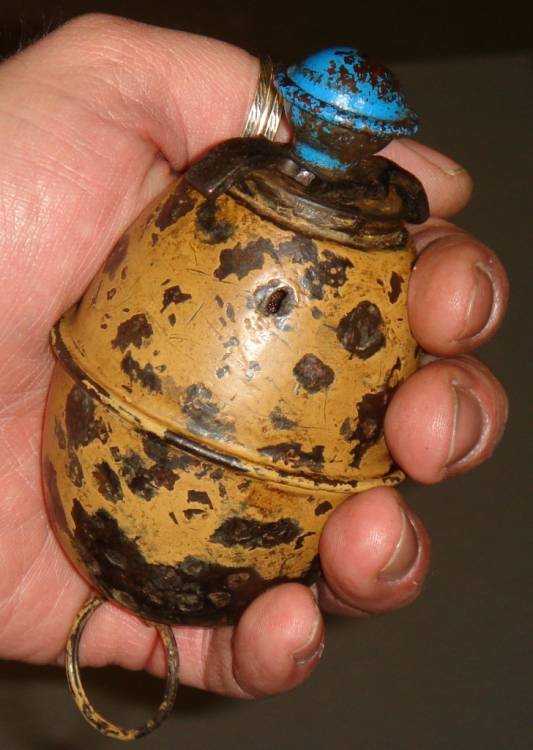 BOMBA A MANO A UOVO I° TIPO. TAPPO COLOR AZZURRO-RITARDO 4 1/2 sec. VERNICE GIALLO SABBIA AFRICA. ORIGINALE BELLICA. INERTE.