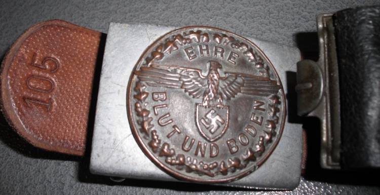 RICAVATA, ALL´EPOCA, APPLICANDO IL DISCO METALLICO CONTENENTE I SIMBOLI ED IL MOTTO DELLE SS SLOVACCHE, SU FIBBIA HITLERJUGEND IN ALLUMINIO. CINTURONE IN CUOIO CON ARDIGLIONE DI TIPO MILITARE CON PUNZONI DEL FABBRICANTE "gut44" E MISURA "105". RARISSIMA, TUTTA ORIGINALE BELLICA.