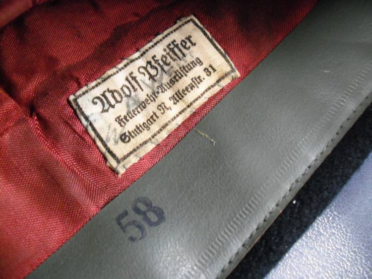 BERRETTO DI SERVIZIO POMPIERI TEDESCHI. IN LANA. CON COCCARDA NAZIONALE IN STOFFA RICAMATA A MACCHINA. FASCETTA PARA-SUDORE IN PELLE, TARGHETTA NOMINATIVA DEL PROPRIETARIO CON INDICAZIONE DEL REPARTO DI APPARTENENZA E TG. 58 ALL´INTERNO. ORIGINALE. CONDIZIONI PARI AL NUOVO.