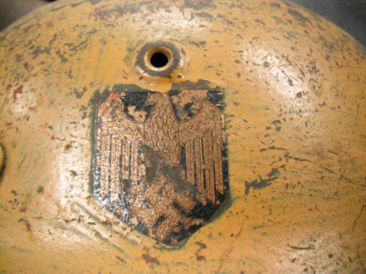 MARCATO Q66. MONOFREGIO MARINA. MIMETIZZAZIONE GIALLO AFRICA, APPLICATA A PENNELLO. TIMBRO DI ACCETTAZIONE (Abnahmestempel) DI FORMA OVALE, AD INCHIOSTRO BEN VISIBILE ALL´INTERNO DEL GUSCIO. INTERNO RIMONTATO, SENZA FELTRO INTERNO, CUOIO ORIGINALE E SOGGOLO ORIGINALE NON MARCATO. BUONE CONDIZIONI.