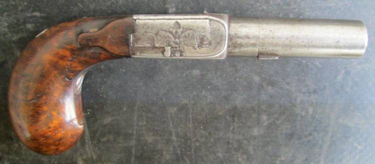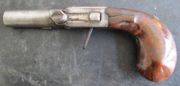 RARA ´MAZZAGATTO´ A PERCUSSIONE LATERALE CON GRILLETTO A SCOMPARSA. DA RIGUARDARE LA MECCANICA IN QUANTO NON ARRIVA AD ARMARE. PICCOLA PLACCA IN ARGENTO SULL´IMPUGNATURA.