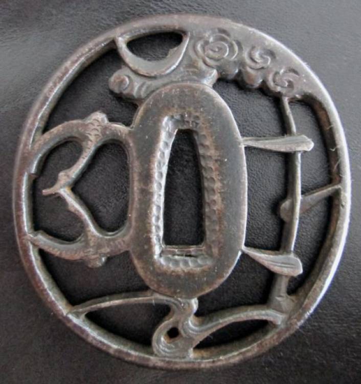 Naga-maru-gata. Sukashi Tsuba. Foglie, flutti, uccelli. Periodo Shin-Shinto. Mu mei.
