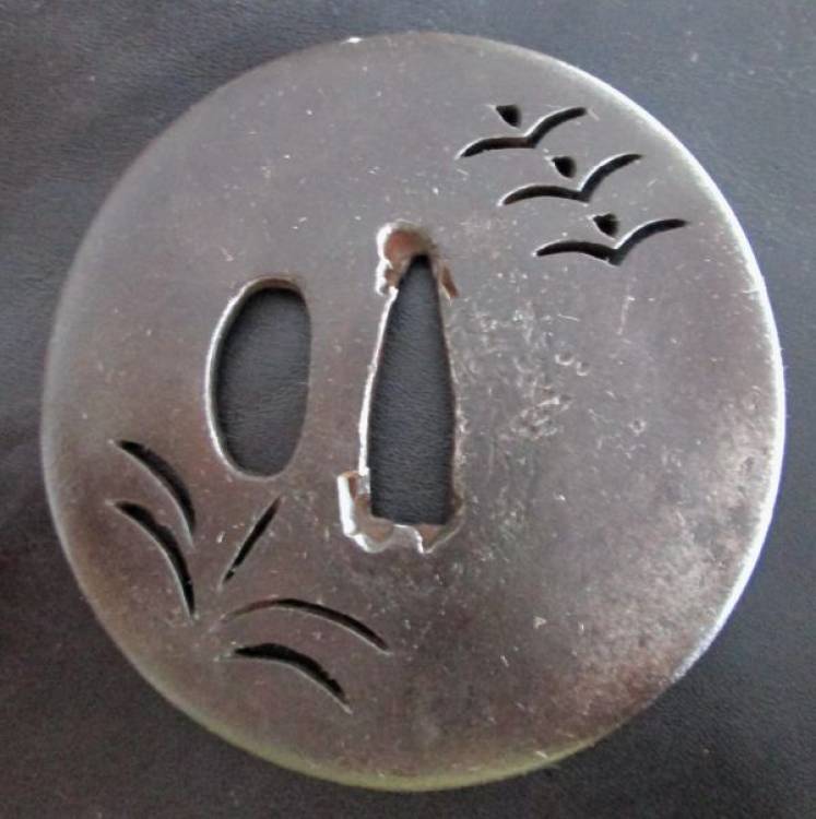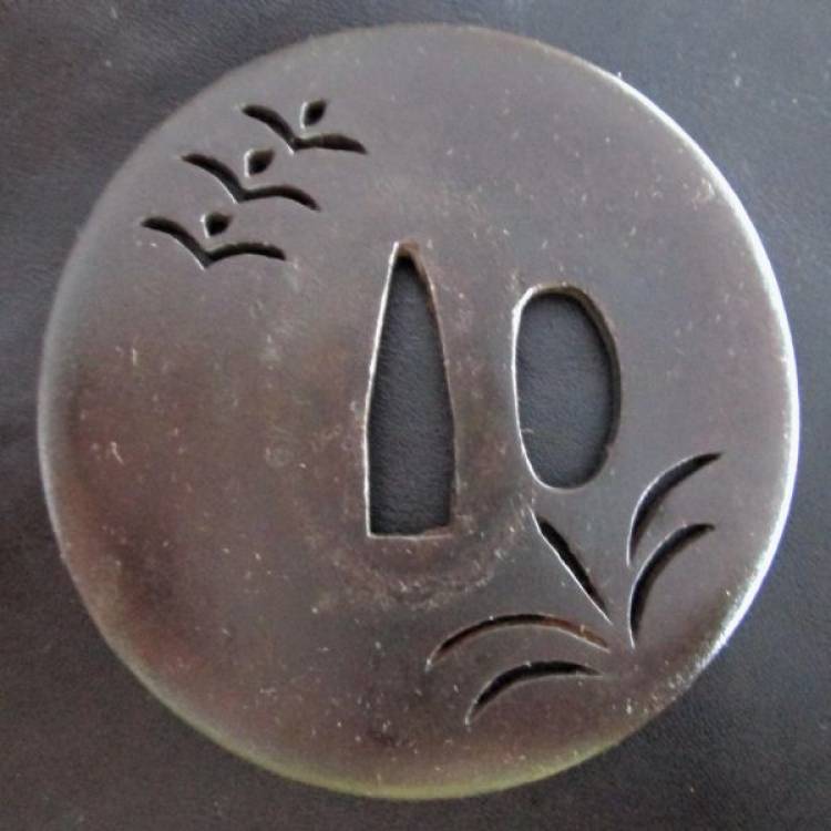 Shin-No-Maru-Gata. Acciaio Shakudo. Uccelli e Fiori a traforo. Periodo Meiji. Mu-mei.