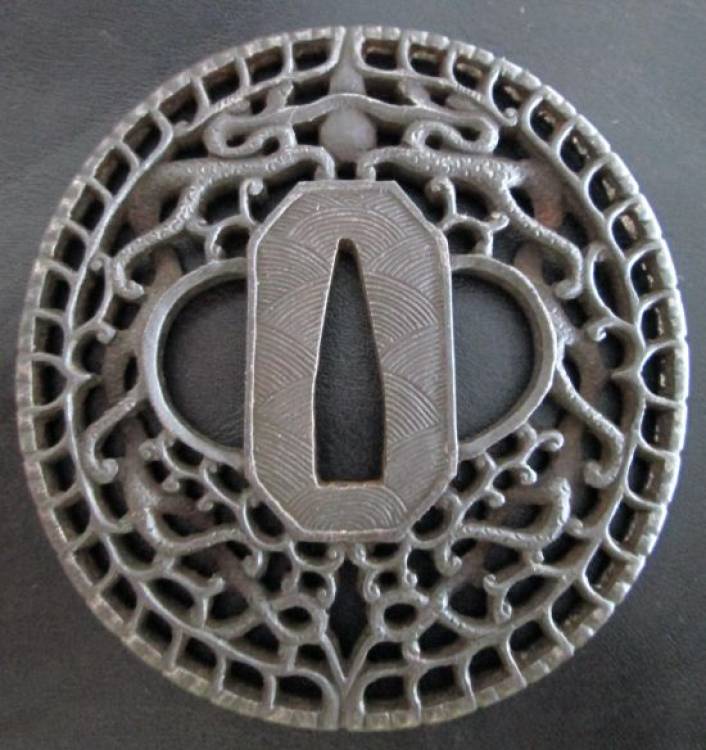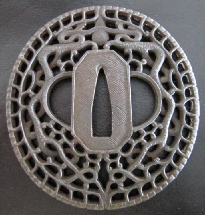 Naga-Maru-Gata: mm.74x70. Namban Tsuba (Modello straniero). Traforata a due ordini. Radici o Animali. Peiodo Shinto. Mu-mei.