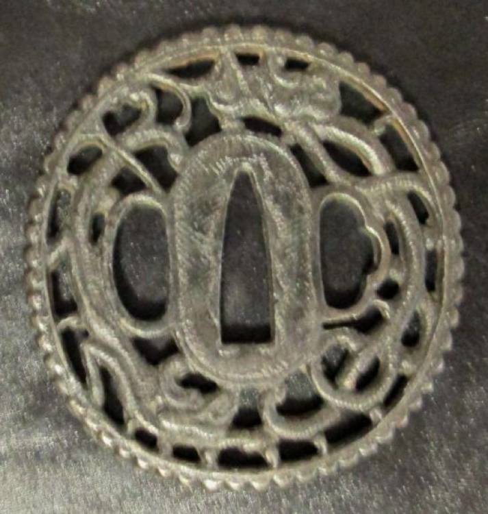 Naga-Maru-Gata (Ovale). Namban Tsuba (Modello Straniero). Draghi Avvolti. Misure: mm. 69x65.