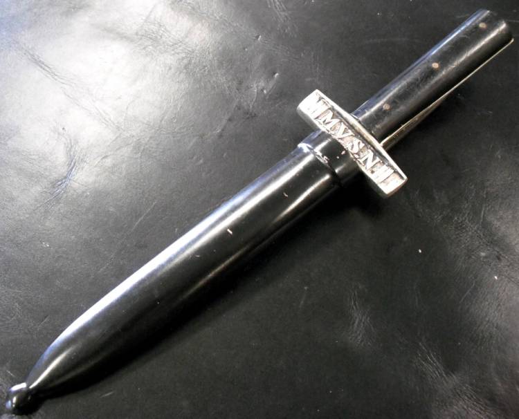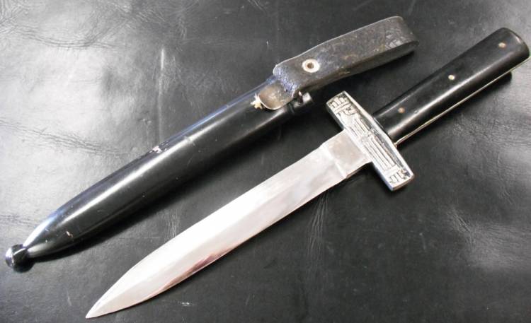 PER MEMBRI DELLA M.V.S.N.(Milizia Volontaria Sicurezza Nazionale) CONFINARIA. LAMA IN ACCIAIO TUTT´UNO CON IL GUARDIAMANO. QUEST´ULTIMO CON SIGLA DELLA FORZA ARMATA, A RILIEVO, AL RECTO E FASCIO LITTORIO, A RILIEVO, SUL RETRO. MANICO IN EBANO. COMPLETO DI FODERO FUORI-ORDINANZA. PROVENIENTE DALLA COLLEZIONE "RUDI D´ANGELO" PEZZO RARO. BELLISSIMO. ORIGINALE