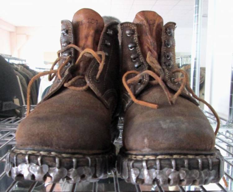 SCARPONI DA ALPINO I MODELLO CON ALLACCIATURA A 4 FORI E 4 GANCETTI. MARCATI E IN CONDIZIONI MOLTO BUONE. CONSERVANO TUTTA LA CHIODATURA.