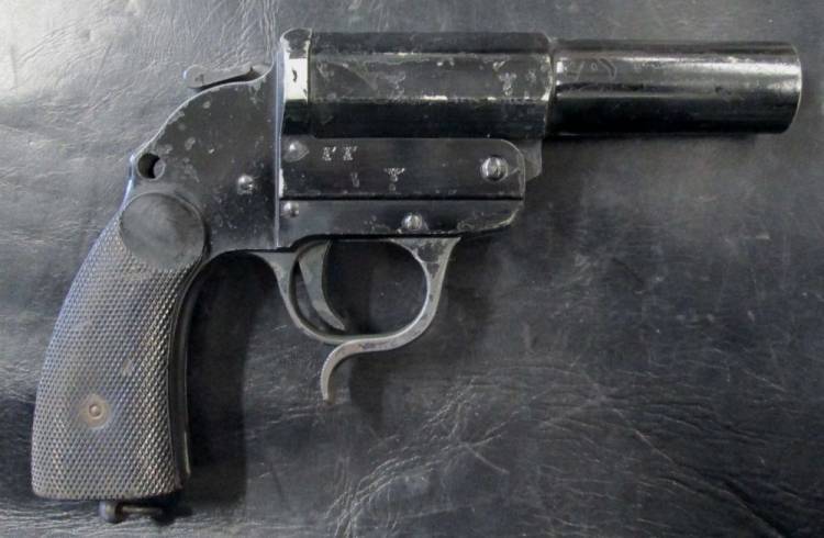 PISTOLA LANCIARAZZI TEDESCA MOD.1936 PRODOTTA NEL 1941 DALLA ´duv´ (Berliner-Lübecker Maschinenfabriken Bernhard Berghaus, Werk Lübeck, Lübeck, Schleswig-Holstein). CONDIZIONI MOLTO BUONE.