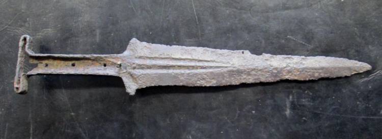 PUGNALE MEDIEVALE DENOMINATO ´BASILARDA´ A DOPPIO FILO. CONDIZIONI DISCRETE. CONSERVA ANCORA QUALCHE RIVETTO DI FISSAGGIO DELL´IMPUGNATURA.