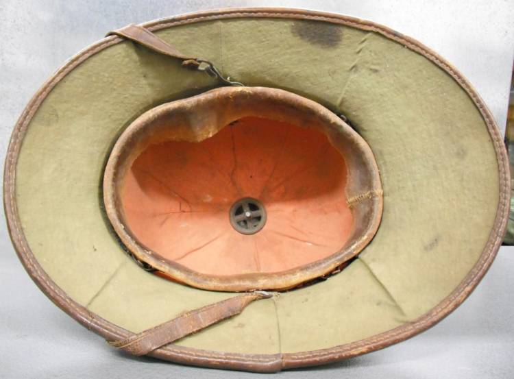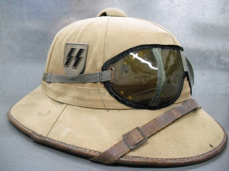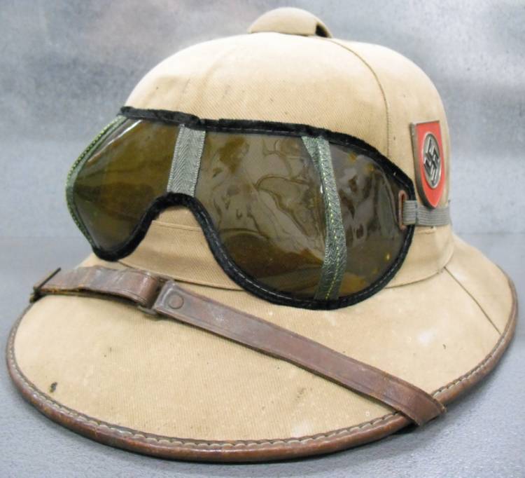 IN SUGHERO, CON COPERTURA IN COTONE COLOR GIALLO SABBIA. FREGI IN METALLO STAMPATO E VERNICIATO, BEN SALDI E SENZA SEGNI DI MANOMISSIONE. INTERNO FODERATO IN STOFFA COLOR ROSSO. ALLUDA CON EVIDENTI SEGNI DI PORTO, MARCATA ALL´INTERNO CON TIMBRI ´1941´ E ´57 OTTO SCHILLENTZ STRAUBING 4´ (FABBRICANTE). COMPLETO DI OCCHIALI ANTI-SABBIA ORIGINALI. CONDIZIONI MOLTO BUONE.