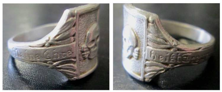 BUONA REPLICA DELL´ANELLO SS Totenkopf CON IL MOTTO DELLE SS: ´MEINE EHRE HEIST TREUE´. ALL´INTERNO MARCATO CON LE RUNE ´SS´ E TITOLO ´800´.