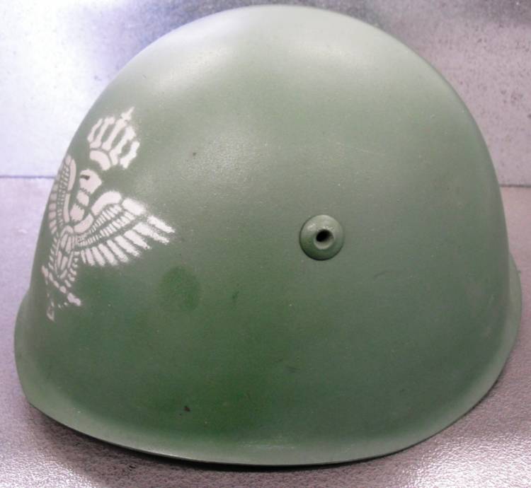 GUSCIO ORIGINALE BELLICO. VERNICE GRIGIO-VERDE NON ORIGINALE. FREGIO ARGENTO, AQUILA "STATO MAGGIORE REGIO ESERCITO" VERNICIATO A MASCHERINA, NON ORIGINALE.