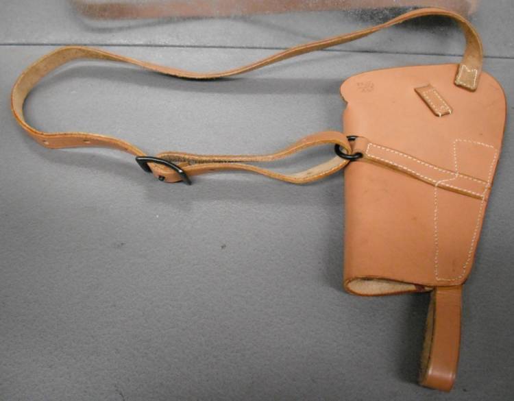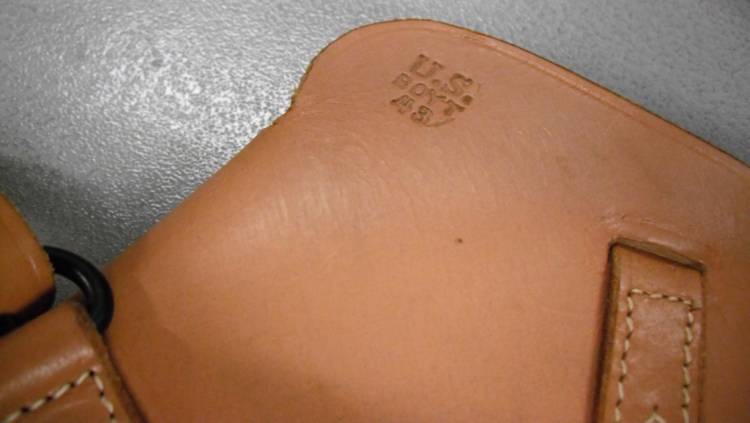 ASCELLARE IN CUOIO MARRONE TIPO EQUIPAGGIO CARRI. LETTERE US A RILIEVO. MARCHIO DI FABBRICA "U.S. BOYT 43" E DATA DI PRODUZIONE. OTTIMA REPLICA.