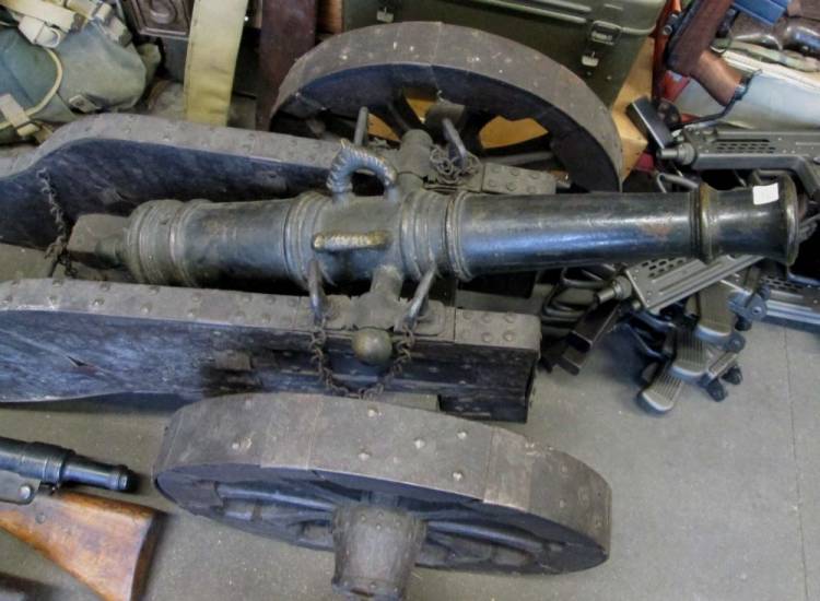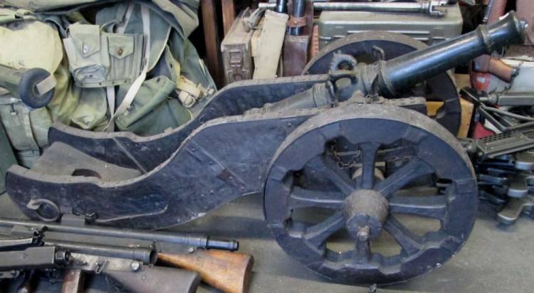 RINFORZATO IN LEGNO SU RUOTE. LUNGHEZZA TOTALE CM.150. CALIBRO 50 mm. CONDIZIONI MOLTO BUONE.