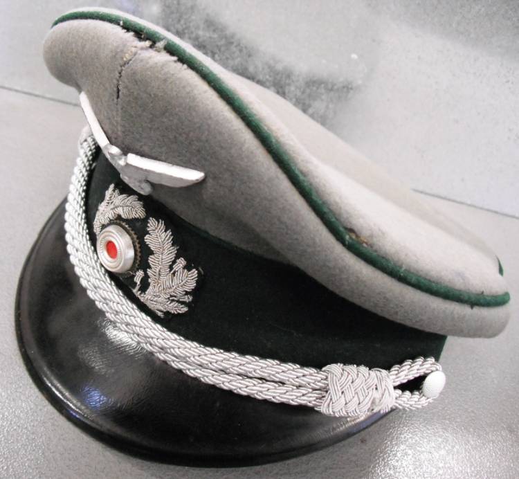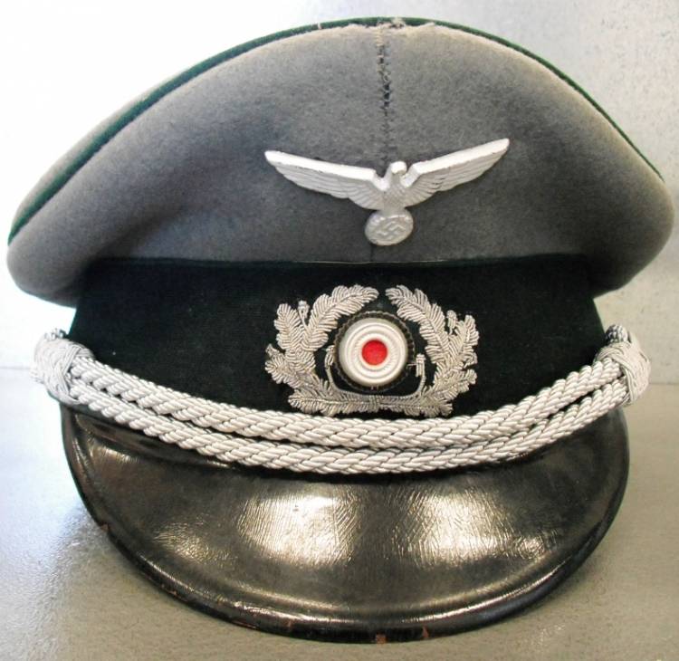 PER UFFICIALE HEER (ESERCITO). WAFFENFARBEN VERDE SCURO- AMMINISTRAZIONE. AQUILA IN ALLUMINIO STAMPATO, COCCARDA CON COLORI NAZIONALI CON FOGLIE DI QUERCIA RICAMATE IN CANOTTIGLIA ARGENTO. QUALCHE TARMATURA SUL PIATTO. INTERNO CON ROMBO IN CELLULOIDE PARZIALMENTE MANCANTE CON NOME E LOGO DEL PRODUTTORE "DALLUGE HANNOVER", TARGHETTA NOMINATIVA DELL´ UFFICIALE. ALLUDA BEN INTEGRA E CON SEGNI DI PORTO. CONDIZIONI MOLTO BUONE.
