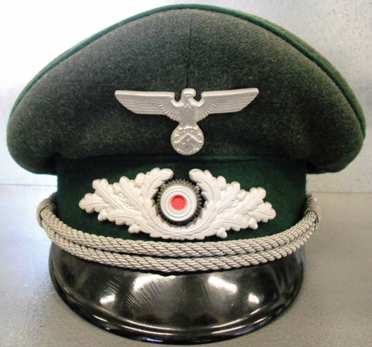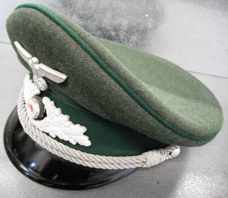 PER UFFICIALE DEL REICHSFORSTAMT (DIPARTIMENTO FORESTALE NAZIONALE). FREGI IN ALLUMINIO STAMPATO SENZA ALCUN SEGNO DI MANOMISSIONE. INTERNO CON ROMBO IN CELLULOIDE E MARCHIO DI FABBRICA; TARGHETTA NOMINATIVA DELL´UFFICIALE. ALLUDA IN CARTONE PRESSATO CON IMPERCETTIBILI SEGNI DI PORTO. BELLA FORMA E CONDIZIONI SPLENDIDE. PRATICAMENTE PARI AL NUOVO.