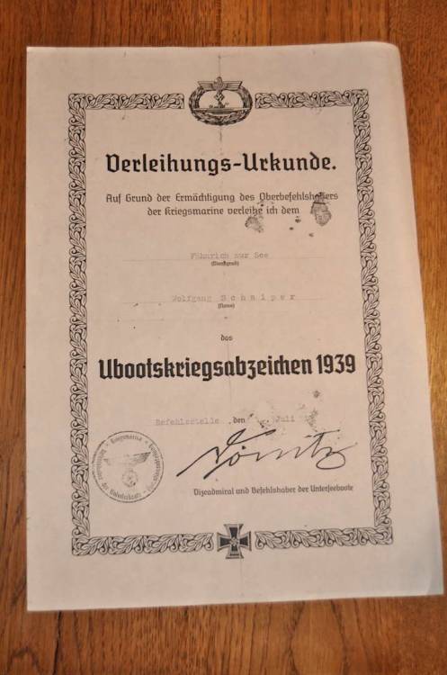 SPLENDIDO SCHIRMUTZE ESTIVO DA UFFICIALE DELLA KM, APPARTENUTO AL SOMMERGIBILISTA LEUTNANT ZUR SEE WOLGANG SCHAIPER. CONSERVA L´ATTESTATO DI CONCESSIONE DEL ´UBOOTSKRIEGSABZEICHEN 1939´ CON IL GRADO DI SOTTUFFICIALE (FAHNRICH ZUR SEE).