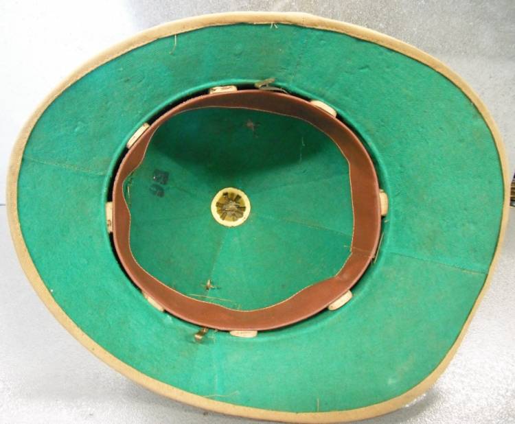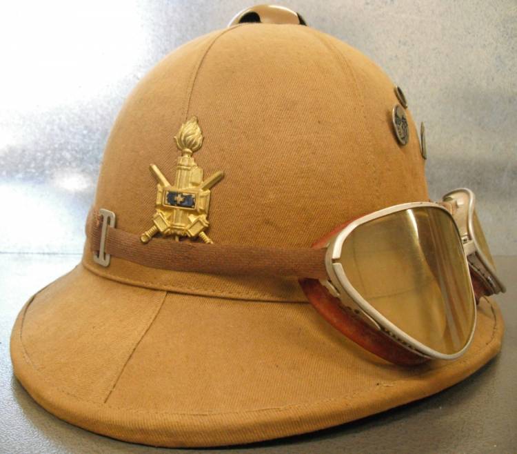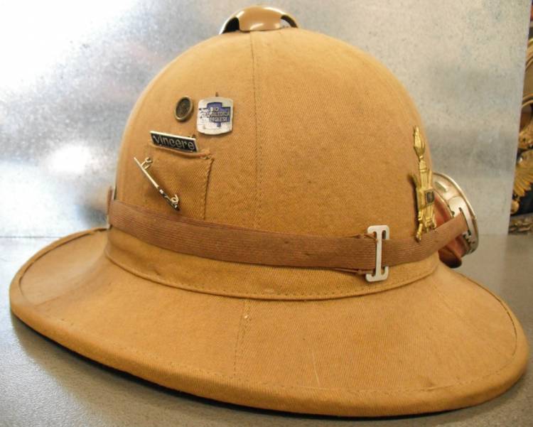 CASCO IN SUGHERO PER CLIMI TROPICALI CCNN A.I. (CORPO CAMICE NERE NAZIONALE AFRICA ITALIANA). FREGIO IN METALLO STAMPATO DORTATO E VERNICIATO. INTERNO CON MAROCCHINO IN TELA CERATA SENZA SEGNI DI USURA. MANCANTE DI SOGGOLO. CON OCCHIALI ANTISABBIA REGOLAMENTARI. SULLA CALOTTA SONO FISSATE DIVERSE SPILLETTE D´EPOCA A CARATTERE PROPAGANDISTICO CON GLI SLOGAN CARI AL REGIME FASCISTA. BELLISSIMO ESEMPLARE IN CONDIZIONI SPLENDIDE.