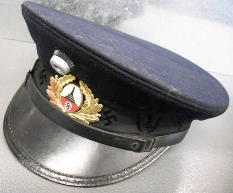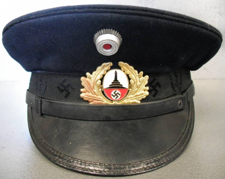 PER SOTTUFFICIALE DEL DEUTSCHER REICHSKRIEGERBUND (ASSOCIAZIONE NAZIONALE TEDESCA DEI VETERANI). FREGIO IN LEGA STAMPATA E PLACCATA; CON SMALTI; BEN SALDO E SENZA SEGNI DI RIMONTAGGIO. FASCIA RICAMATA IN STOFFA NERA, SOFRAFASCIA E PIATTO SENZA TARMATURE. INTERNO IN COTONE AZZURRO CON IMPPRESSO IL SIMBOLO DELL´ASSOCIAZIONE. ALLUDA IN PELLE CON LIEVISSIMI SEGNI DI UTILIZZO E INIZIALI ("J G M") DEL PROPRIETARIO SU OVALI METALLICI. BERRETTO INDOSSATO POCO E IN SPLENDIDE CONDIZIONI.