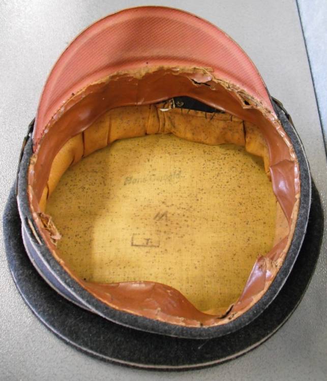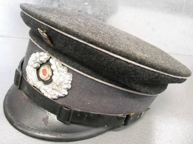 PER SOTTUFFICIALE DELLA DEUTSCHES ROTES KREUZ (CORPO DELLA CRECE ROSSA TEDESCA). AQUILA IN METALLO CON SMALTI, COCCARDA NAZIONALE CON FRONDE DI CUERCIA IN ALLUMINIO STAMPATO; BEN SALDI E SENZA VISIBILI SEGNI DI MANOMISSIONE. FASCIA ,SOVRAFASCIA E PIATTO, SENZA TRAMATURE. TESA IN VULCANFIBER CON LIEVI SCREPOLATURE. INTERNO IN COTONE CON TIBRI (NON PIU´ LEGGIBILI) E NOMINATIVO DEL SOTTUFFICIALE. ALLUDA IN TELA CERATA CON LACERAZIONI. OGGETTO RUSPANTE E ORIGINALE.