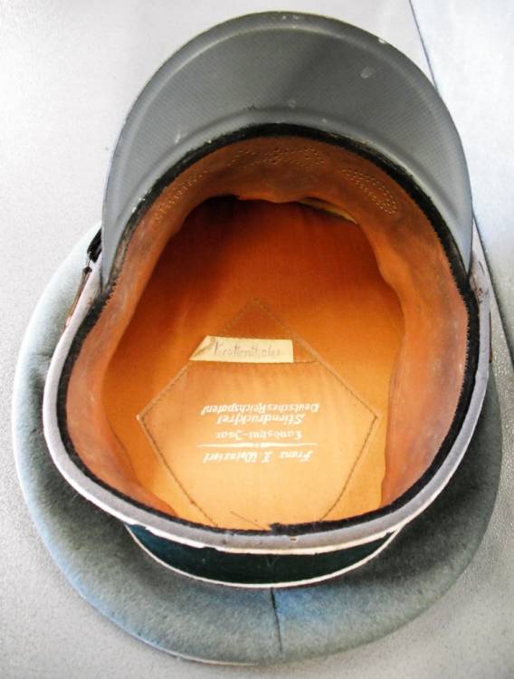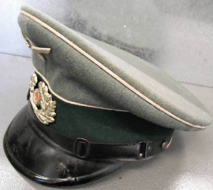 SCHIRMMUTZE PER SOTTUFFICIALE HEER (ESERCITO). WAFFENFARBEN BIANCO-FANTERIA. AQUILA IN METALLO STAMPATO MANCANTE DI UNA LINGUETTA POSTERIORE PER IL FISSAGGIO, MA POSIZIONATA CORRETTAMENTE. COCCARDA NAZIONALE CON FRONDE DI QUERCIA IN ALLUMINIO STAMPATO, BEN SALDI E NON MANOMESSI. FASCIA VERDE SCURO, SOVRAFASCIA E PIATTO IN OTTIME CONDIZIONI, SENZA LACERAZIONI O TARMATURE. INTERNO IN SETA CON DIAMANTE IN CELLULOIDE CON MARCHIO DEL PRODUTTORE. TARGHETTA NOMINATIVA DEL SOTTUFFICIALE. ALLUDA IN CUOIO LAVORATO CON SEGNI DI PORTO. ECCELLENTI CONDIZIONI GENERALI.