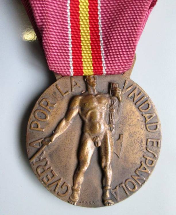 Bella medaglia assegnata a tutti i volontari della guerra di Spagna. Riporta congiunti svastica, fascio e simbolo della Falange. Con Nastro.