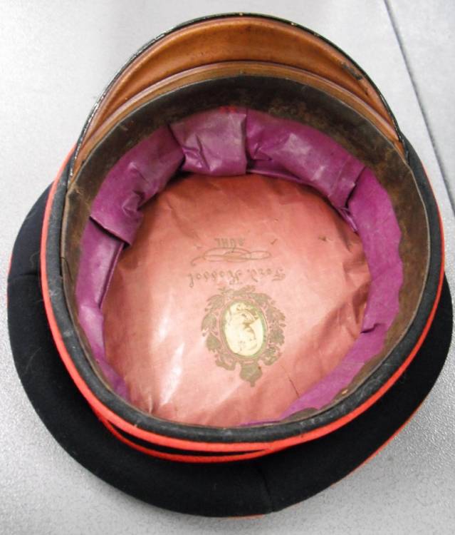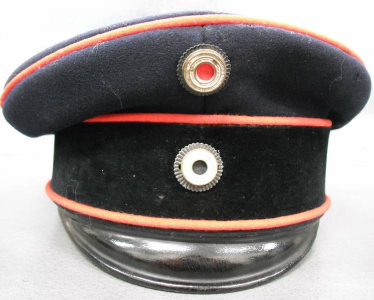 PER UFFICIALE ESERCITO PRUSSIANO. IN LANA BLU CON FASCIA NERA. WAFFENFARBE ROSSO. COCCARDA NAZIONALE TEDESCA E COCCARDA BIANCO NERA PRUSSIANA. NESSUN SEGNO DI MANOMISSIONE. INTERNO IN CARTA TELATA CON MARCHIO DEL FABBRICANTE STAMPATO E FOTO DEL KAISER INSCRITTA IN OVALE DORATO. ALLUDA IN CUOIO CON SEGNI DI PORTO. CONDIZIONI OTTIME.
