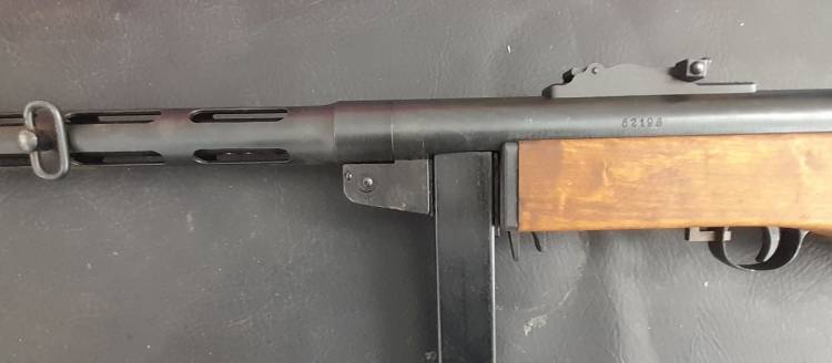 RARA PISTOLA MITRAGLIATRICE FINLANDESE SUOMI MOD. KP-31/42. ALL´INIZIO DEL ´42 FU INTRODOTTO UNO SPENGIFIAMMA PER STABILIZZARE IL TIPO SUL PRECEDENTE SUOMI KP-31.