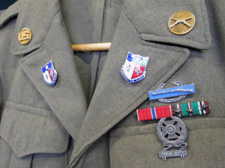 SPLENDIDA IKE JACKET MOD.43 in Lana Mutard da ´Technician 4th Grade´ del 141° Rgt. della 36^ Divisione Texas (annientato sul fiume Rapido - Frosinone nel 1944), con varie decorazioni, tra cui il ´Combat Infantry Badge´ ed il ´Bronze Star Ribbon´. Condizioni eccellenti. Trovata insieme alla Camicia (2051) ed ai Pantaloni (2052).