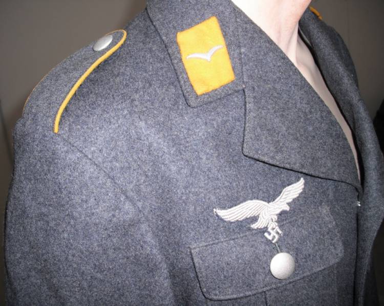 QUATTRO TASCHE MODELLO 35 IN LANA GRAUBLAU, PER FLIEGER (SOLDATO SEMPLICE) DELLA LUFTWAFFE. WAFFENFARBE GIALLO ORO-EQUIPAGGI DI VOLO E PARACADUTISTI (FALLSCHIRMJAGER). COMPLETA DI SPALLINE, AQUILA DA PETTO E MOSTRINE DI GRADO. TIMBRI DI ACCETTAZIONE E ATTAGLIAMENTO ALL´INTERNO. MARCHIO DI FABBRICA E DATA 1937.