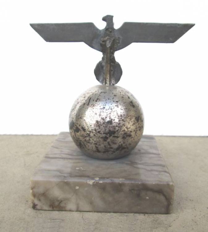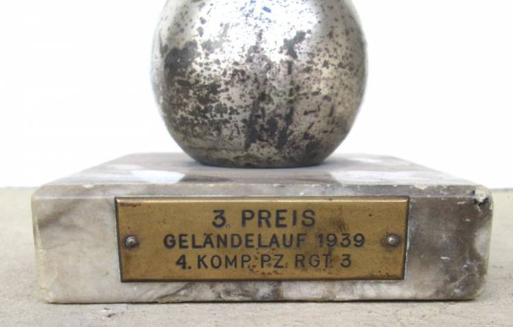 PICCOLA SCULTURA CON AQUILA DEL REICH CHE SOVRASTA IL GLOBO/PALLA DI CANNONE. PREMIO AL 3° CLASSIFICATO NELLE ESERCITAZIONI DI TRUPPE CORAZZATE DEL 1939. LA BASE IN MARMO RIPORTA UNA TARGHETTA IN OTTONE; ´3.PREIS GELANDELAUF 1939 4.KOMP.PZ.RGT.3´. Altezza cm.12. CONDIZIONI MOLTO BUONE.