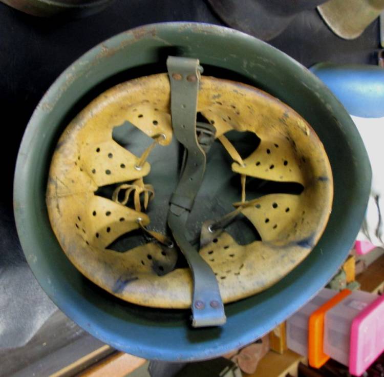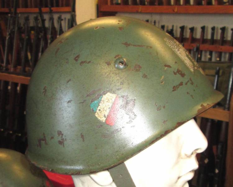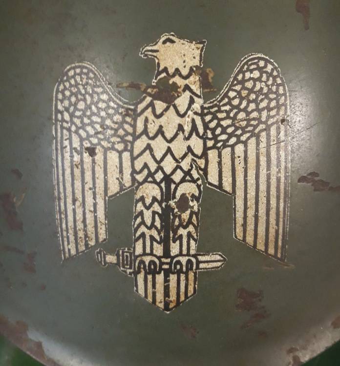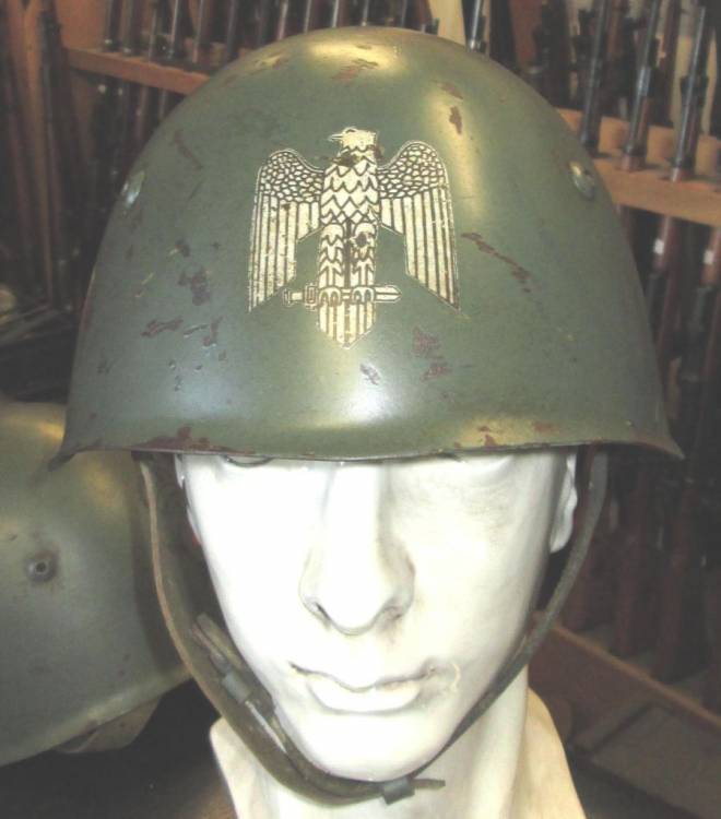 SPLENDIDO ELMETTO DIVISIONALE DELLA REPUBBLICA SOCIALE CON DOPPIO FREGIO, AQUILA FRONTALE (del tipo bianco a bordature nere) E SCUDETTO NAZIONALE SUL LATO DESTRO (USATO DALLE DIVISIONI SAN MARCO, MONTEROSA, LITTORIO).