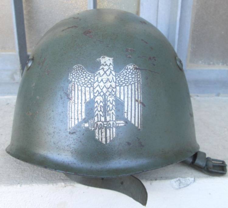 SPLENDIDO ELMETTO DIVISIONALE DELLA REPUBBLICA SOCIALE CON DOPPIO FREGIO, AQUILA FRONTALE (del tipo bianco/argento a bordature nere) E SCUDETTO NAZIONALE SUL LATO SINISTRO (USATO DALLA DIVISIONE BERSGLIERI ´ITALIA´).