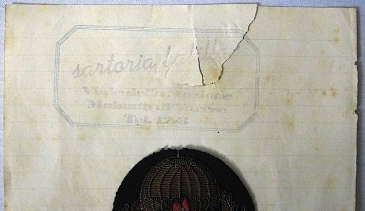 Il distintivo è ancora cucito sul foglio campionario della sartoria che porta l´intestazione ´SARTORIA BALILLA - Viale della Stazione - Malnate di Varese - Tel. 12-8´. Il comando della Scuola Paracadutisti di Tradate era situata a 11 km. di distanza da Malnate. Un brevetto identico è pubblicato in ´Distintivi e Medaglie della R.S.I., 2° vol., pag,43 di Fausto Sparacino. Condizioni eccellenti.