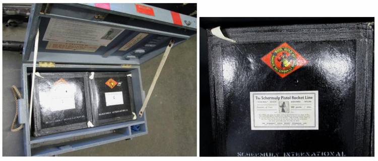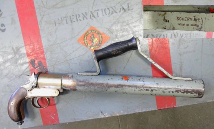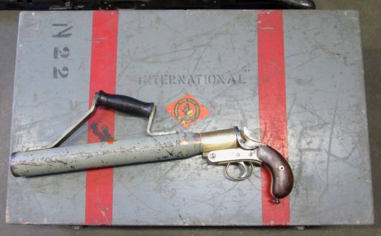 RARA PISTOLA LANCIASAGOLE DELLA ROYAL NAVY DELLA WEBLEY-SCHERMULY MOD.1918. IMPIEGATA NELLA SECONDA GUERRA MONDIALE. COMPLETA DI CASSA DI TRASPORTO CON DUE SCATOLE DI SAGOLE NUOVE DA APRIRE (INTROVABILE). CONDIZIONI MOLTO BUONE.