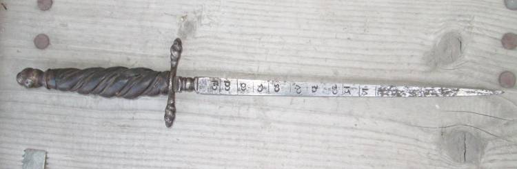 STILETTO O FUSETTO DA BOMBARDIERE, CHIAMATO ANCHE ´CENTOVENTI´ PER LA CARATTERISTICA SCALA GRADUATA INCISA SULLA LAMA, ATTA A MISURARE IL CALIBRO DEI CANNONI. FORNIMENTI IN FERRO ED IMPUGNATURA A TORCIGLIONE IN CORNO.