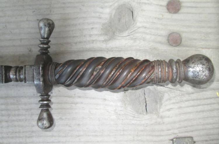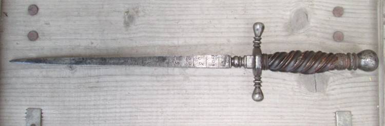 STILETTO O FUSETTO DA BOMBARDIERE, CHIAMATO ANCHE ´CENTOVENTI´ PER LA CARATTERISTICA SCALA GRADUATA INCISA SULLA LAMA, ATTA A MISURARE IL CALIBRO DEI CANNONI. FORNIMENTI IN FERRO ED IMPUGNATURA A TORCIGLIONE IN LEGNO PREGIATO.