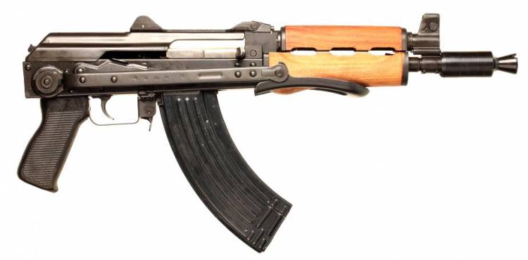 AK IN VERSIONE CORTA PER TRUPPE SPECIALI IN CAL. 7,62X39. ARMA COMUNE CON CALCIO PIEGHEVOLE FISSATO IN APERTURA. SERBATOIO DA 5 COLPI.