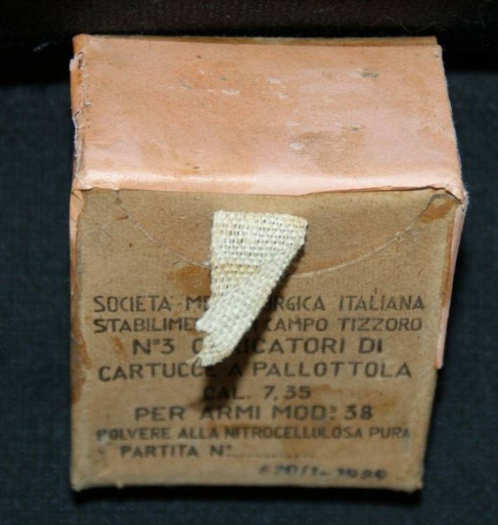 SCATOLA PER MUNIZIONI DEL CARCANO ´91/38 IN CAL. 7,35x51. Può CONTENERE TRE PIASTRINE DA SEI COLPI CIASCUNA. PRODOTTA DALLA S.M.I. (Società Metallurgica Italiana) NELLO STABILIMENTO CAMPO TIZZORO - 1939. CONDIZIONI ECCELLENTI.